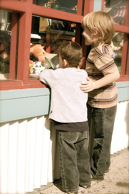 Lisa, there’s something about that picture of the boys… one of my favorites. Is it knowing tht they’re looking at toys, or the protective touch of Matty’s hand on David’s back? Or is it your honesty in being thankful the toy store was closed? Tee hee! I feel the same way sometimes.