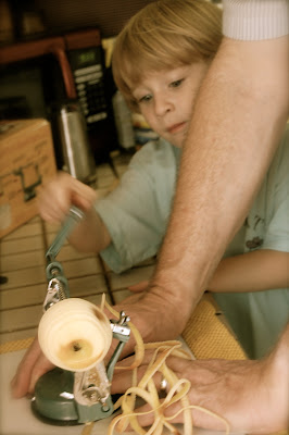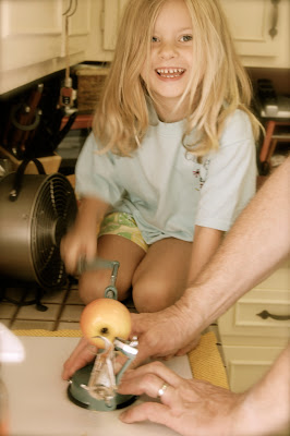 grandpa anchored the apple peeler, corer, slicer, while the kids took turns spinning the handle.